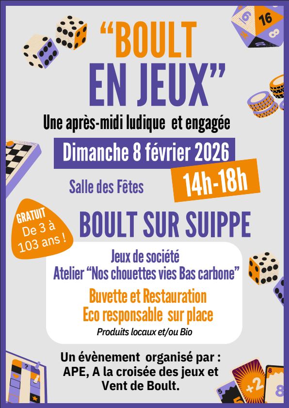 Venez nombreux le dimanche 8 février pour l'après-midi jeux organisé par les associations : APE, A la croisée des jeux, Vent de Boult.